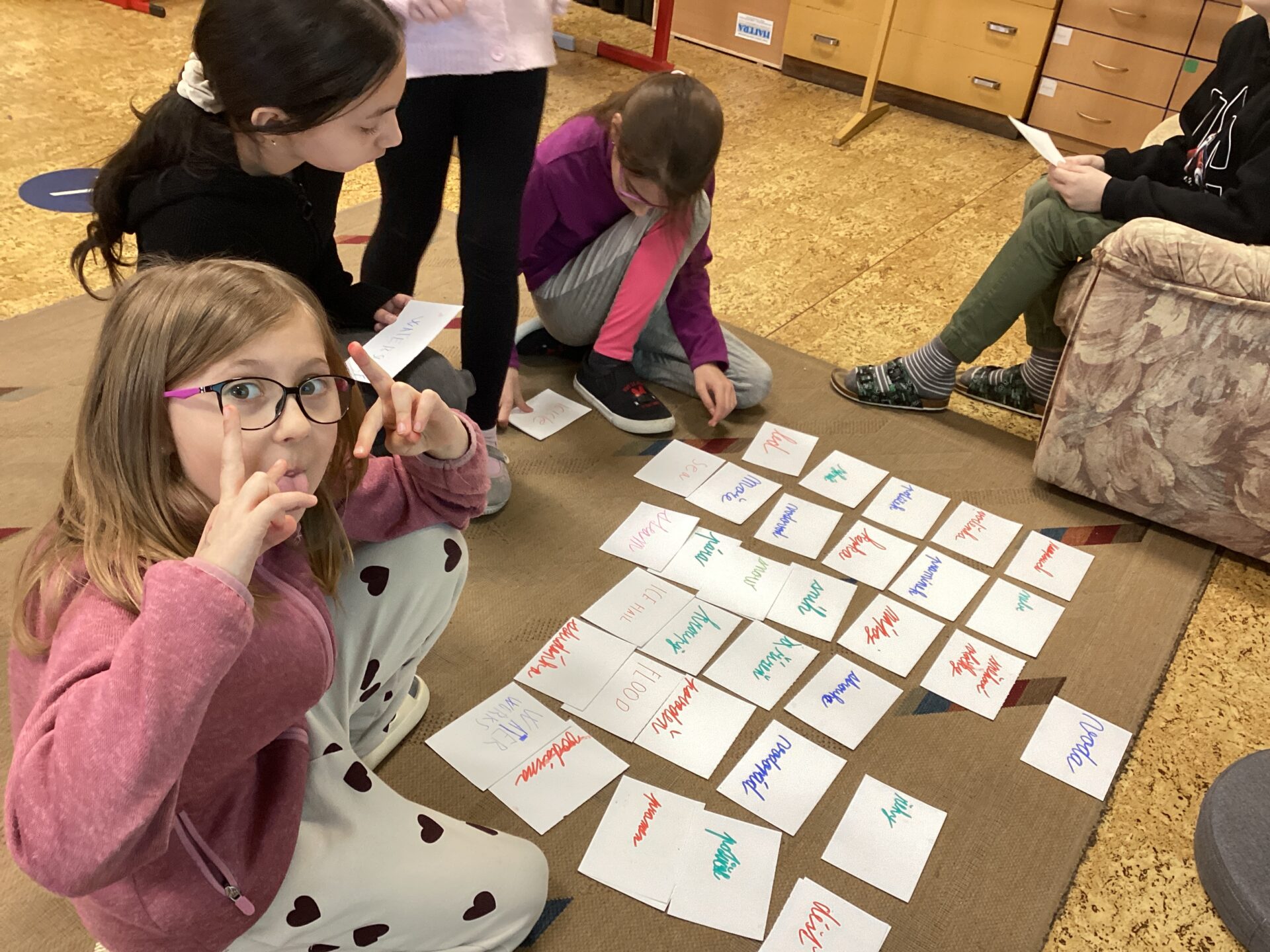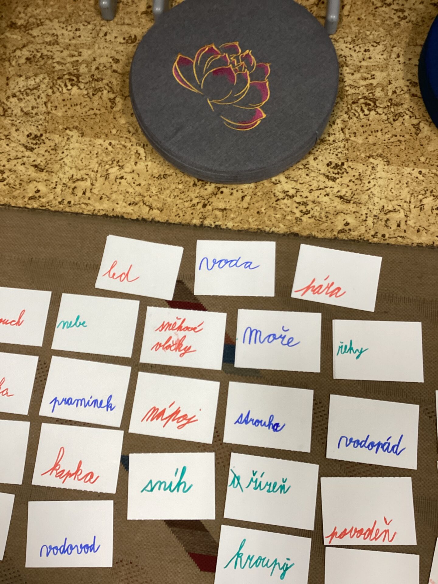 Úplně na začátku nám paní učitelka řekla, ať napíšeme vše, co nás napadne, když se řekne voda. Slova jsme psali na kartičky a napadlo nás toho skutečně hodně. Potom jsme si ještě napsali kartičky se slovy, v jaké podobě najdeme vodu v přírodě. Přiřadili jsme správně vodu ke kapalnému skupenství, páru ke skupenství plynnému a led ke skupenství pevnému.