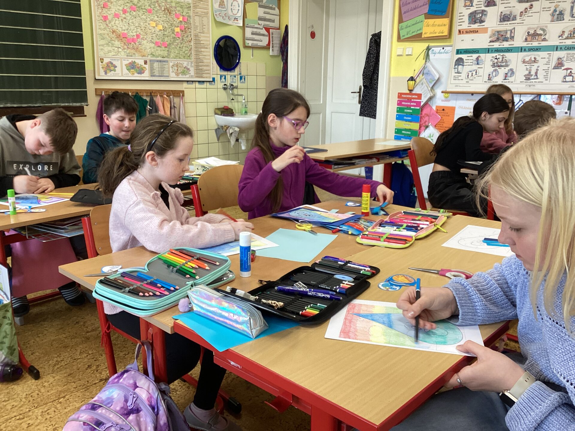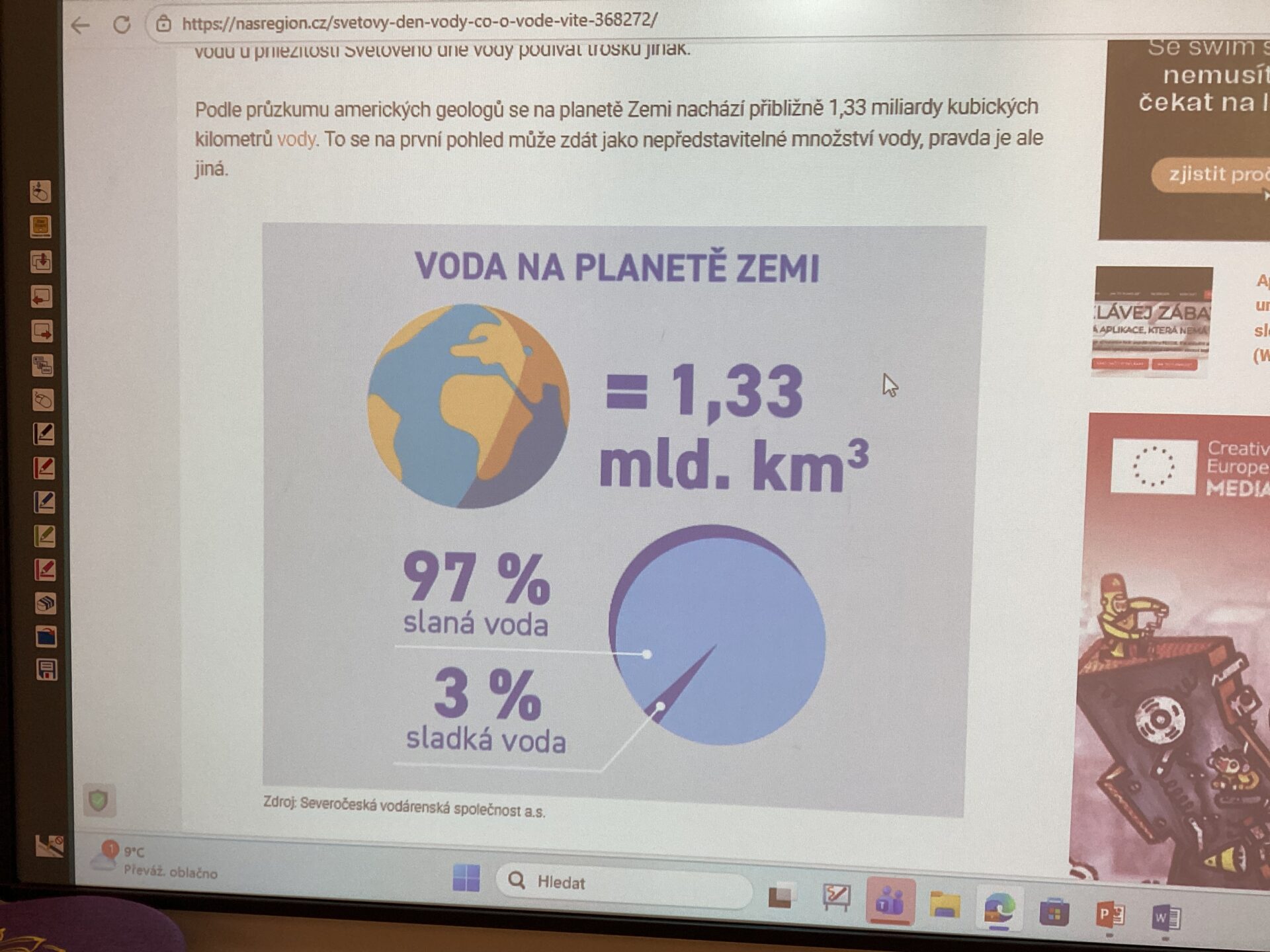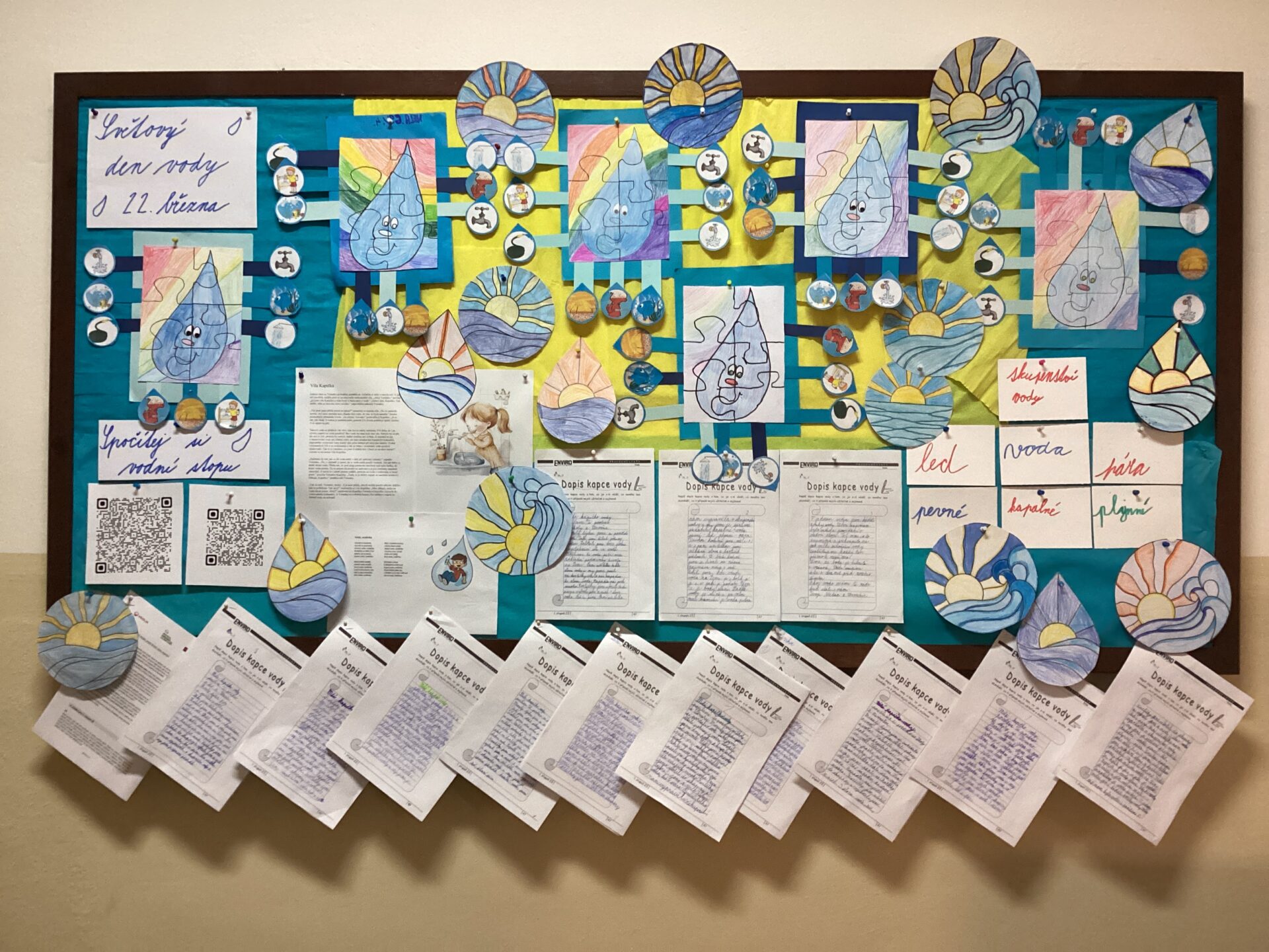 V hodině literatury jsme si četli naučné články, příběhy a básničky o vodě. Například jsme se dozvěděli, kde všude je voda na Zemi a kolik jí je, a že voda může být slaná i sladká. Také jsme sledovali různá naučná videa o vodě. Dozvěděli jsme se, co je vodní stopa, a překvapilo nás, kolik vody každý z nás denně spotřebuje přímo nebo nepřímo.